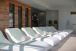 зона за отдих около басейна с шезлонги и чадъри