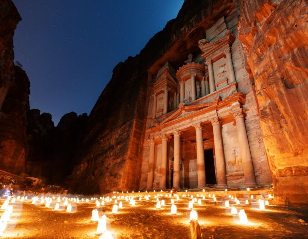 Закуска. Напускане на кампа. Отпътуване за целодневна екскурзия до Петра – уникален град, изсечен в скалите, свещен град на набатейците, заселили се тук преди повече от 2000 години, превърнали го в център на всички търговски пътища, свързващи Изтока със Запада. Избрана за едно от новите седем чудеса на света, Петра е безспорно един от най-впечатляващите и богати архитектурни комплекси, включена в списъка на ЮНЕСКО за Световното културно и природно наследство. Посещението на Петра започва с разходка през прохода Сик - тясно, сенчесто ждрело между две надвиснали скали. В края на този проход се разкрива смайваща и магическа гледка през пролуката - съкровищницата „Ал Хазне“, владетелска гробница на набатейците в класически гръцки стил, изсечена в огромната лицева част на 39-метрова скала.Това е най-добре запазената фасада в Петра и се смята за шедьовър на набатейската цивилизация. От съкровищницата започва главният път, който постепенно ще разкрие мистериите на този древен град - т. нар. „Улица на фасадите“, Амфитеатърът - единственият в света, изсечен в скала, владетелските гробници и Набатейският храм. Над комплекса се извисява манастирът „Ад Деир“, до който се стига по 800 стъпала. Късно следобед отпътуване към столицата Аман. Настаняване. Вечеря. Нощувка.