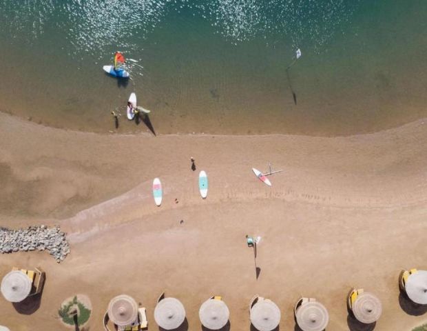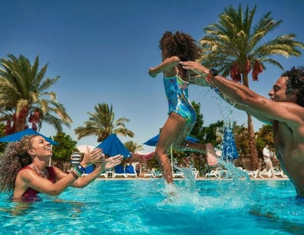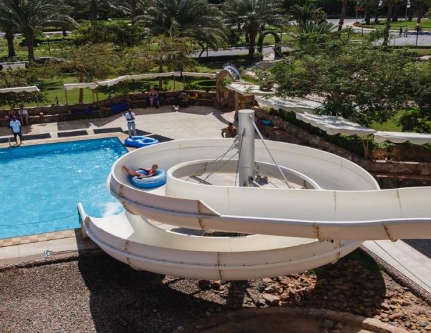Desert Rose 5* разполага със собствен девствен пясъчен плаж с дължина от 1км, с 40 000 м² природна лагуна със златист пясък. Хотелът предлага на своите клиенти идеална атмосфера за забавления или просто да се насладят на прекрасния ненадминат климат на Червено море. Хотелът разполага с 4 плувни басейна, 1 с олимпийски размери, голям плувен басейн с палуби за слънчеви бани и бар край него, отопляем семеен плувен басейн и детски плувен басейн, специализиран за бебета и малки деца със собствен мини душ и мини столове. Като допълнение Аквапаркът предлага още и 6 водни пързалки.