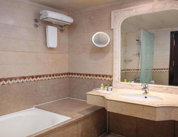 Хотелът е луксозен комплекс с ориенталска архитектура и просторна градина. Разполага с основна сграда и няколко допълнителни крила, предлагащи разнообразие от удобства. Подходящ е както за семейства с деца, така и за двойки, търсещи спокойна почивка.  Собствен, с коралов риф. Чадъри, шезлонги и матраци на плажа и при басейна - безплатно. Плажни кърпи – безплатно.